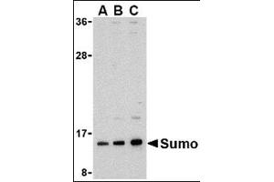 The sumo family of proteins is related both structurally and functionally to ubiquitin in that they are post-translationally attached to the e-amino group of a lysine residue of the substrate protein. This sumoylation plays a number of roles in DNA replication and repair, protein targeting to various subnuclear structures, and the regulation of numerous cellular processes including the inflammatory response in mammalian cells. Sumo was initially identified as a covalent modification of RanGAP1 in studies on nuclear import in mammalian cells. More recently, sumo has been shown to be involved in the regulation of transcription factors, possibly by enhancing their interactions with co-repressors. Sumo is also thought to play some role in the modulation of ubiquitin-mediated degradation of proteins by acting as an inhibitor. At least four different isoforms of sumo are known to exist.Synonyms: GAP-modifying protein 1, GMP1, SMT3 homolog 3, SMT3C, SMT3H3, Sentrin, Small ubiquitin-related modifier 1, UBL1, Ubiquitin-homology domain protein PIC1, Ubiquitin-like protein SMT3C, Ubiquitin-like protein UBL1