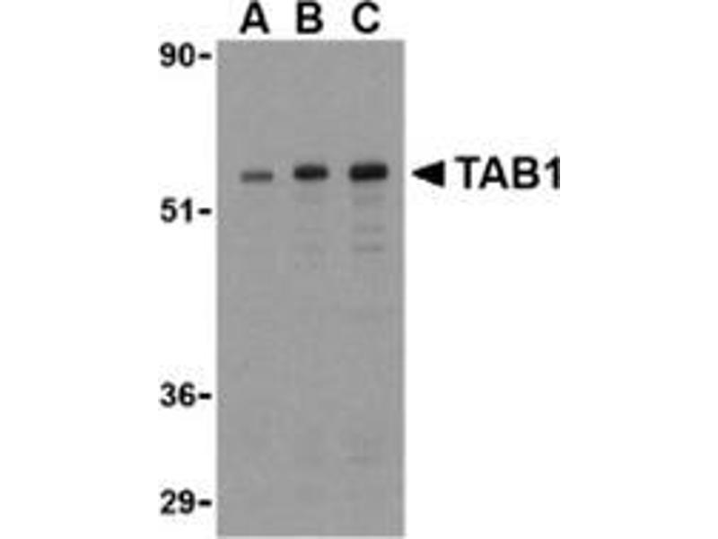 TAB1 was identified as a regulator of the MAP kinase kinase kinase TAK1/MAP3K7 (1), which is known to mediate various intracellular signaling pathways, such as those induced by TGF-beta and members of the Toll-IL-1R (TIR) superfamily (2), thus acting as an intermediate in both proliferative and innate and adaptive immune responses (3). This protein, together with either TAB2 or TAB3, activates TAK1 kinase in response to upstream signals (4,5). It has been shown that the C-terminal portion of TAB1 is sufficient for binding and activation of TAK1, while a portion of the N-terminus acts as a dominant-negative inhibitor of TGF-beta, demonstrating how this protein can function as a mediator between TGF-beta receptors and TAK1 (6).Synonyms: Mitogen-activated protein kinase kinase kinase 7-interacting protein 1, TAK1-binding protein 1, TGF-beta-activated kinase 1-binding protein 1