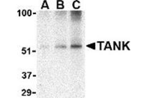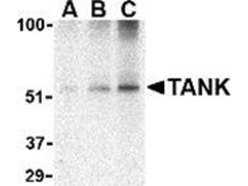TANK was initially identified as a novel TRAF-interacting protein that regulated TRAF-mediated signal transduction. Specifically, ligand binding by surface receptors in the tumor necrosis factor (TNF) receptor and Toll/interleukin-1 (IL-1) receptor families lead to the formation of a TRAF/TANK complex that mediates the activation of the transcription factor NF-kappaB. This activation of NF-kappaB occurs through an association with the kinases IKKepsilon and TBK1. More recently, it was shown that these proteins can then form a complex with NEMO, a protein that regulates the activity of the IkappaB complex. This suggests that in addition to the possibility that TBK1 and IKKepsilon activate the IKKs, the association with the IKK complex may help these kinases modulate other functions, such as the transactivation potential of NF-kappaB proteins. At least two isoforms of TANK are known to exist.Synonyms: I-TRAF, TRAF family member-associated NF-kappa-B activator, TRAF-interacting protein, TRAF2