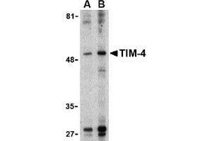 The T cell immunoglobulin and mucin domain containing protein (TIM) family encodes cell surface receptors that are involved in the regulation of T helper (Th) -1 and -2 cell-mediated immunity. TIM-4, which is preferentially expressed on macrophages and dendritic cells, is the natural ligand of TIM-1, and this binding leads to T-cell expansion and cytokine production. Unlike other members of the TIM family, TIM-4 lacks a putative tyrosine phosphorylation signal sequence in its intracellular domain. The TIM-4 gene maps to a locus associated with predisposition to asthma in both mice and humans and with its connection to TIM-1-triggered Th2 responsiveness, may be considered as a candidate disease/predisposition gene for asthma.Synonyms: T-cell immunoglobulin and mucin domain-containing protein 4, T-cell membrane protein 4, TIM-4, TIM4, TIMD-4