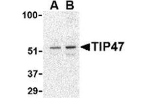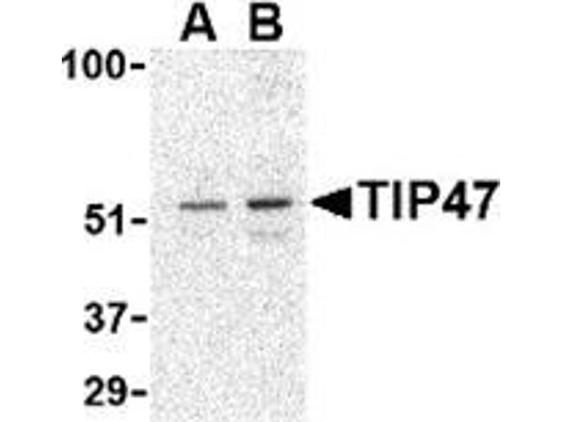 Tail-interacting protein (TIP47) is a cytosolic protein essential for the transport of mannose-6-phosphate receptors (MPRs) from endosomes to the trans-Golgi compartments in cells. TIP47 is recruited from the cytoplasm to the late endosomal surface by the Ras-associated protein Rab9 GTPase, enabling it to bind more efficiently to MPR cytoplasmic domains. Recently, it was shown that TIP47 regulates the expression of Rab9, as expression of siRNA to TIP47 in transfected cells dramatically decreased the half-life of the Rab9 protein in addition to stabilizing the subcellular localization of Rab9. At least two isoforms of TIP47 are known to exist.Synonyms: 47 kDa mannose 6-phosphate receptor-binding protein, Cargo selection protein TIP47, Mannose-6-phosphate receptor-binding protein 1, Placental protein 17