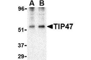 Tail-interacting protein (TIP47) is a cytosolic protein essential for the transport of mannose-6-phosphate receptors (MPRs) from endosomes to the trans-Golgi compartments in cells. TIP47 is recruited from the cytoplasm to the late endosomal surface by the Ras-associated protein Rab9 GTPase, enabling it to bind more efficiently to MPR cytoplasmic domains. Recently, it was shown that TIP47 regulates the expression of Rab9, as expression of siRNA to TIP47 in transfected cells dramatically decreased the half-life of the Rab9 protein in addition to stabilizing the subcellular localization of Rab9. At least two isoforms of TIP47 are known to exist.Synonyms: 47 kDa mannose 6-phosphate receptor-binding protein, Cargo selection protein TIP47, Mannose-6-phosphate receptor-binding protein 1, Placental protein 17
