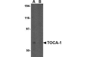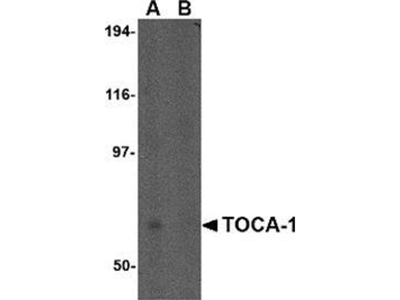 Actin reorganization is important for the regulation of neuronal morphology. A protein involved in this process, the transducer of cdc42-dependent actin assembly 1 (TOCA-1) protein, a member of the evolutionarily conserved pombe CDC15 homology (PCH) protein family, is an essential component of the Cdc42 pathway. TOCA-1 binds both N-WASP and Cdc42 and is essential for Cdc42- and PIP2-induced actin polymerization, suggesting that TOCA-1 mediates Cdc42-dependent actin nucleation by activating the N-WASP-WIP complex. Decreased expression of TOCA-1 significantly enhances neurite elongation in PC-12 cells, its overexpression in the same cells suppresses neurite elongation. It has been suggested that TOCA-1 negatively regulates axon branching by regulating membrane trafficking by regulating membrane trafficking through the F-BAR/EFC domain. Multiple isoforms of TOCA-1 are known to exist.Synonyms: C1orf39, Formin-binding protein 1-like, TOCA1, Transducer of Cdc42-dependent actin assembly protein 1