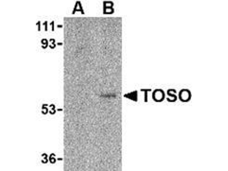 Apoptosis is an important process by which normal tissue homeostasis and function are maintained. One of the major signals that regulate this process is mediated by the activation of the Fas receptor by its ligand. This leads to the formation of a Fas-associated death domain (FADD)- containing death-inducing signaling complex and the activation of caspase-8, which in turn activates downstream effector caspases, such as caspase-3 and -7. Recent experiments have shown that overexpression of Toso, a novel regulator of Fas-induced apoptosis in lymphoid cells, in Jurkat cells as well as transgenic mice render these cells resistant to Fas-induced apoptosis but not to TRAIL-induced apoptosis. Furthermore, Toso was found to associate with FADD, suggesting that Toso functions by disrupting the formation of the death-inducing signaling complex. Despite its predicted molecular weight, Toso often migrates at 60 kDa in SDS-PAGE.Synonyms: Fas apoptotic inhibitory molecule 3, Regulator of Fas-induced apoptosis Toso