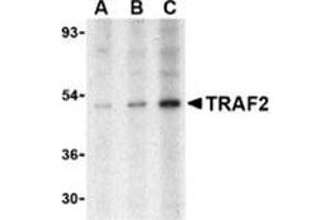 Tumor necrosis factor (TNF) receptor associated factors (TRAFs) were initially discovered as adaptor proteins that link the TNF receptor superfamily to signaling pathways and are thus important regulators of cell death and cellular response to stress (1). TRAF proteins share a homology region that allows them to bind to cell receptors and other TRAF proteins, causing the activation of different signal cascades depending on the TRAFs involved. For example, TRAF2 and TRAF3 directly bind to the CD40, a NF receptor superfamily member involved in inducing B cell immunity (2), and are critical for NF-kappaB activation in mouse B lymphocytes (3). TRAF2 along with TRAF6 has also been shown to be required for CD40 signaling in nonhemopoietic cells (4). TRAF2 also interacts with the TRFR superfamily member lymphotoxin-b receptor (LTbR) in association with TRAF3 and the apoptosis inhibitors cIAP1 and Smac (5).Synonyms: TNF receptor-associated factor 2, Tumor necrosis factor type 2 receptor-associated protein 3
