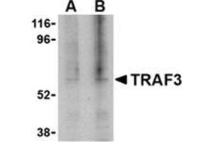 Tumor necrosis factor (TNF) receptor associated factors (TRAFs) are the major signal transducers for the TNF receptor superfamily and the interleukin-1 receptor/Toll-like receptor (IL-1/TLR) superfamily (1). TRAF3 was first identified by its interaction with CD40 and the Epstein-Barr virus transforming protein LMP1 (2,3). Several TRAF3 mRNA splice variants exist and some of these can activate the transcription factor NF-kappaB (4). Besides CD40, TRAF3 also interacts with the TRFR superfamily member lymphotoxin-beta receptor (LTbetaR) in association with TRAF2 and the apoptosis inhibitors cIAP1 and Smac. It has been suggested that TRAF3 induces mitochondria-mediated apoptosis upon binding of the TNF family cytokine LIGHT by LTbetaR (5).Synonyms: CAP-1, CAP1, CD40 receptor-associated factor 1, CD40-binding protein, CD40BP, LAP1, LMP1-associated protein, TNF receptor-associated factor 3