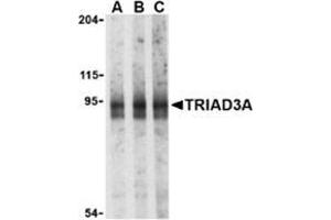Activation of NF-kappaB as a result of Toll-like receptor (TLR) and IL-1 receptor signaling is a major component of innate immune responses (reviewed in 1). Signals from these receptors are relayed by a number of adapter molecules such as TRIF, TIRAP, and MyD88 (2). Several regulatory mechanisms exist to control TLR signal transduction, including the inhibition of TLR expression and signaling by molecules such as ST2 and SIGIRR (3,4). Another mechanism is by the ubi-quitinization of selected TLRs by TRIAD3A, an E3 ubiquitin-protein ligase (5). TRIAD3A is a RING finger protein that can bind to TLR4 and TLR9, and to a lesser extent TLR3 and TLR5, catalyzing the ubiquitization of these molecules. Overexpression of TRIAD3A promoted the nearly complete degradation of TLR4 and TLR9, this reduction was reflected in the decreased signal-specific activation by ligands specific for these TLRs. Conversely, depletion of TRIAD3A resulted in enhanced TLR activation (5).Synonyms: E3 ubiquitin-protein ligase RNF216, RING finger protein 216, TRIAD3, Triad domain-containing protein 3, UBCE7IP1, Ubiquitin-conjugating enzyme 7-interacting protein 1, ZIN, Zinc finger protein inhibiting NF-kappa-B
