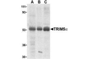 TRIM5 is a member of a broad family of otherwise unrelated proteins defined by the presence of a tripartite motif containing a RING domain, a B-box type 1, and a B-box type 2, followed by a coiled-coil region . TRIM5 has six alternately spliced isoforms, the longest of which is the alpha variant which also contains a carboxy-terminal B30.2 (SPRY) domain. Expression of TRIM5alpha variants from humans, rhesus monkeys, and African green monkeys enabled resistance to infection by various retroviruses including HIV-1, albeit at differing efficiencies. All TRIM5alpha variants could inhibit at least two different retroviruses, but not from those viruses isolated from the same species, suggesting that TRIM5alpha acts as a natural barrier to cross-species retrovirus transmission.Synonyms: RING finger protein 88, Tripartite motif-containing protein 5