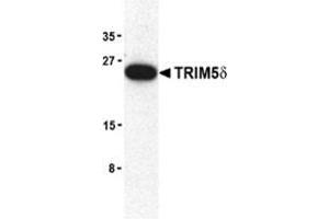 TRIM5 is a member of a broad family of otherwise unrelated proteins defined by the presence of a tripartite motif containing a RING domain, a B-box type 1, and a B-box type 2, followed by a coiled-coil region (1). TRIM5 has five alternately spliced isoforms, the longest of which is the ? variant which also contains a carboxy-terminal B30.2 (SPRY) domain (1). Expression of TRIM5α variants from humans, rhesus monkeys, and African green monkeys enabled resistance to infection by various retroviruses including HIV-1 (2,3), albeit at differing efficiencies. The TRIM5δ isoform has been shown to colocalize with the topoisomerase I-interacting proteins BTBD1 and BTBD2 in punctate or elongated cytoplasmic bodies in several mouse and human cells where it appears to serve as a scaffold for the assembly of endogenous BTBD proteins. TRIM5δ also exhibits autoubiquitination activity in a RING finger- and UbcH5B-dependent manner (4).Synonyms: RING finger protein 88, Tripartite motif-containing protein 5