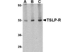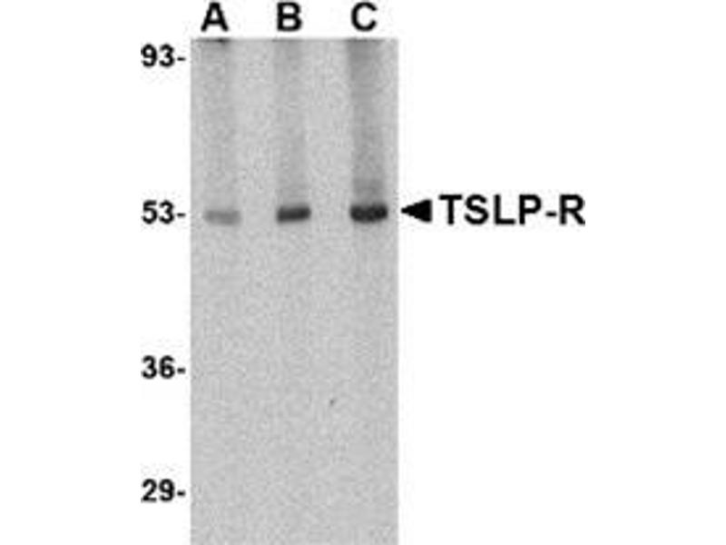 Thymic stromal lymphopoietin (TSLP) has recently been identified as an important factor capable of driving dendritic cell maturation and activation. It is involved in the positive selection of regulatory T cells, maintenance of peripheral CD4+ T cell homeostasis and the induction of CD4+ T cell-mediated allergic reaction. TSLP is also capable of supporting the growth of fetal liver and adult B cell progenitors and their differentiation to the IgM-positive stage of B cell development. Its receptor TSLP-R will bind TSLP in a low-affinity fashion in transfected cells, co-transfection with IL-7R-alpha cDNA results in high-affinity binding and a functional heteromeric complex. This heteromeric receptor requires stat5 for TSLP-mediated signal transduction and is inhibited by SOCS-1. Despite its predicted molecular weight, TSLP-R often migrates at a higher molecular weight in SDS-PAGE.Synonyms: Cytokine receptor-like 2, Cytokine receptor-like factor 2, IL-XR, ILXR, TSLPR, Thymic stromal lymphopoietin protein receptor