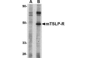 Thymic stromal lymphopoietin (TSLP) has recently been identified as an important factor capable of driving dendritic cell maturation and activation. It is involved in the positive selection of regulatory T cells, maintenance of peripheral CD4+ T cell homeostasis and the induction of CD4+ T cell-mediated allergic reaction. TSLP is also capable of supporting the growth of fetal liver and adult B cell progenitors and their differentiation to the IgM-positive stage of B cell development. Its receptor TSLP-R will bind TSLP in a low-affinity fashion in transfected cells, co-transfection with IL-7R-alpha cDNA results in high-affinity binding and a functional heteromeric complex. This heteromeric receptor requires stat5 for TSLP-mediated signal transduction and is inhibited by SOCS-1. The approximately 75 kDa band seen in the immunoblot may be a post-translationally modified form of TSLP-R.Synonyms: Cytokine receptor-like 2, Cytokine receptor-like factor 2, IL-XR, ILXR, TSLPR, Thymic stromal lymphopoietin protein receptor