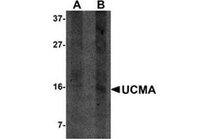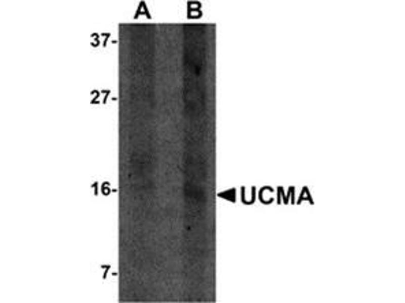 UCMA is a secreted cartilage-specific protein that was discovered in a screen for differentially expressed genes in retinoic acid-treated mouse chondrocytes. It was also identified in a human chondrocyte EST screen for candidate genes of skeletal dysplasias. UCMA expression is thought to parallel that of collagen II with its expression decreasing with maturation chrondrocytes mature. UCMA is processed by a furin-like protease into two fragments, an amino-terminal fragment and a carboxy-terminal fragment (UCMA-C). Application of recombinant UCMA-C to primary osteoblasts, mesenchymal stem cells, and MC3T3-E1 pre-osteoblasts interferes with their osteogenic differentiation, but does not affect expression of chondrocyte-specific genes or chondrocyte proliferation, suggesting that UCMA may be involved in the negative control of osteogenic differentiation of osteochondrogenic precursor cells. At least two isoforms of UCMA are known to exist.Synonyms: C10orf49, Unique cartilage matrix-associated protein
