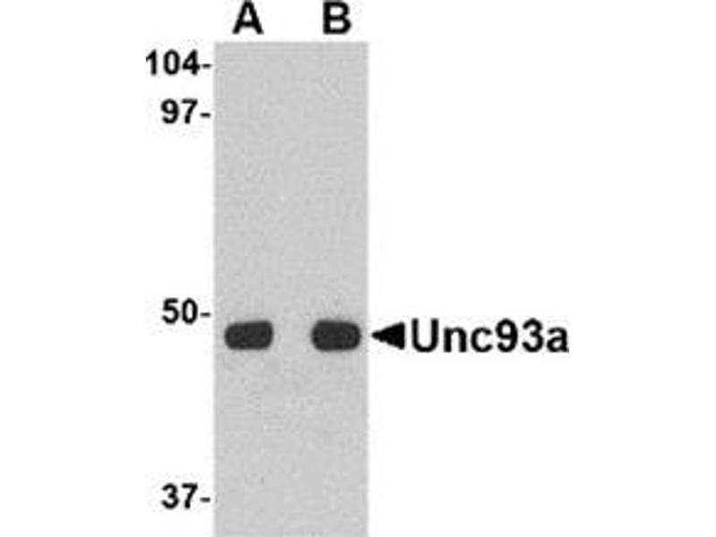 Unc93a, a human homolog of the C. elegans Unc93 gene, was initially identified by the sequencing of chromosome 6q27 at D6S193 as loss at this region correlated with sporadic ovarian cancer. Further analysis however, showed no tumor suppressor role for Unc93a. Unlike Unc93b, another homolog of the C. elegans Unc93 gene that is crucial for Toll-like receptor (TLR) signaling, the function of Unc93a is unknown. It is expressed in testis, small intestine, spleen, prostate and ovary. Two isoforms of Unc93a are known to exist.Synonyms: homolog of C. elegans Unc93