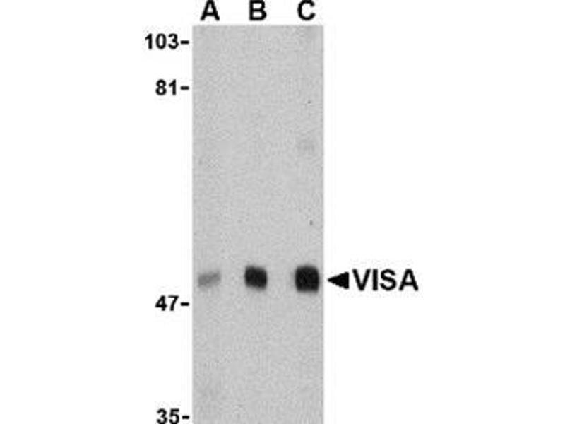 Two distinct signaling pathways activate the host innate immunity against viral infection. One pathway is reliant on members of the Toll-like receptor (TLR) family while the other uses the RNA helicase RIG-I as a receptor for intracellular viral double-stranded RNA as a trigger for the immune response. VISA is a mitochondrial membrane protein that was identified as a critical component in the IFN-b signaling pathways that recruits IRF-3 to RIG-I, leading to its activation and that of NF-kappaB. VISA is also thought to interact with other components of the innate immune pathway such as the TLR adapter protein TRIF, TRAF2 and TRAF6. VISA also interacts with the IKKalpha, IKKbeta and IKKepsilon kinases through its C-terminal region. Cleavage of this region by the Hepatitis C virus (HCV) protease allows HCV to escape the host immune system. At least three isoforms of VISA are known to exist.Synonyms: CARD adapter inducing interferon-beta, Cardif, IPS1, Mitochondrial antiviral-signaling protein, Mitochondrial antiviral-signaling protein, Putative NF-kappa-B-activating protein 031N, VISA, Virus-induced-signaling adapter, nterferon-beta promoter stimulator protein 1