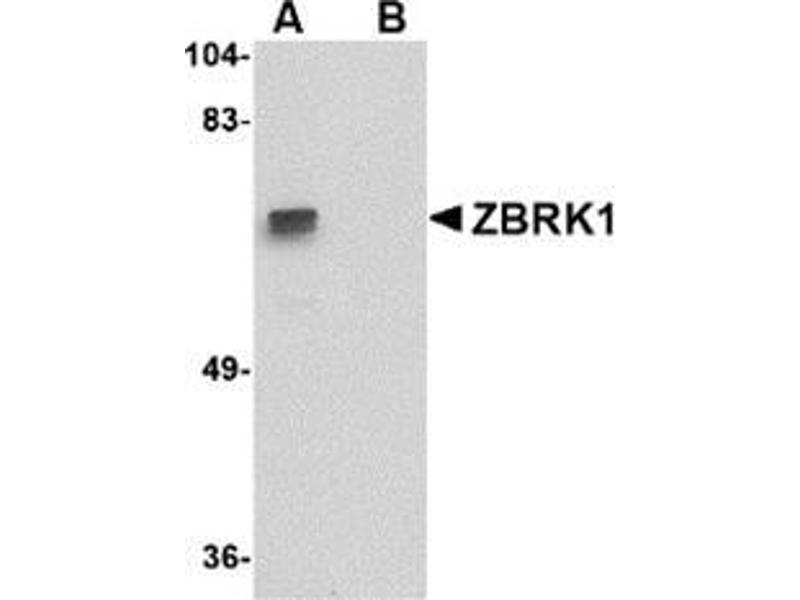 ZBRK1 is a member of the Kruppel-associated box-zinc finger protein (KRAB-ZFP) protein family of transcriptional repressors. ZBRK1 has been shown to not only be up-regulated in senescent fibroblasts but also interacts with BRCA1, a transcriptional regulator with tumor suppressor activity. ZBRK1 binds to a specific sequence within the GADD45 gene, supporting the assembly of a nuclear complex containing BRCA1 and repressing its transcription. Recent experiments demonstrate that ZBRK1 can homo-oligomerize in vitro and in vivo through a C-terminal transcriptional repression domain (CTRD), and this oligomerization facilitates the ZBRK1-directed transcriptional repression through ZBRK1 response elements. These results suggest that higher order ZBRK1 oligomers may assemble through both protein-DNA and CTRD-dependent protein-protein interactions.Synonyms: KRAB zinc finger protein ZFQR, ZBRK1, ZFQR, Zinc finger and BRCA1-interacting protein with a KRAB domain 1, Zinc finger protein 350, Zinc finger protein ZBRK1