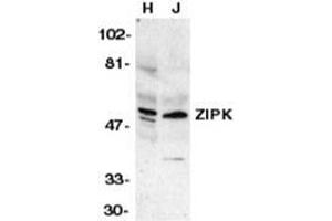 Apoptosis is mediated by death domain containing adapter molecules and a caspase family of proteases. Certain serine/threonine protein kinases, such as ASK-1 and RIP, are mediators of apoptosis. A novel serine/threonine kinase that mediates apoptosis was recently identified and designated ZIP kinase . ZIP kinase contains an N-terminal kinase domain and a C-terminal leucine zipper structure and binds to ATF4 that is a member of ATF/CREB family. ZIP kinase has high sequence homology to DAP kinase (death-associated protein kinase), which is a mediator of apoptosis induced by gamma interferon. Overexpression of ZIP kinase induces apoptosis. ZIP and DAP kinases represent a novel kinase family, which mediates apoptosis through their catalytic activities. The messenger RNA was ubiquitously expressed in various tissues .Synonyms: DAP kinase 3, DAP-like kinase, DLK, Death-associated protein kinase 3, ZIP-kinase