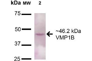 A 1:1000 dilution of ABIN5066455 was sufficient for detection of VMP1 in 15 μg of Human 293T Cell Lysates by ECL immunoblot analysis using goat anti-rabbit IgG:HRP as the secondary antibody.