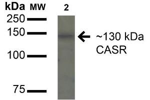 A 1:1000 dilution of ABIN5066803 was sufficient for detection of calcium-sensing receptor (CASR) in 15 μg of Human HeLa Cell Lysates by ECL immunoblot analysis using goat anti-rabbit IgG:HRP as the secondary antibody.