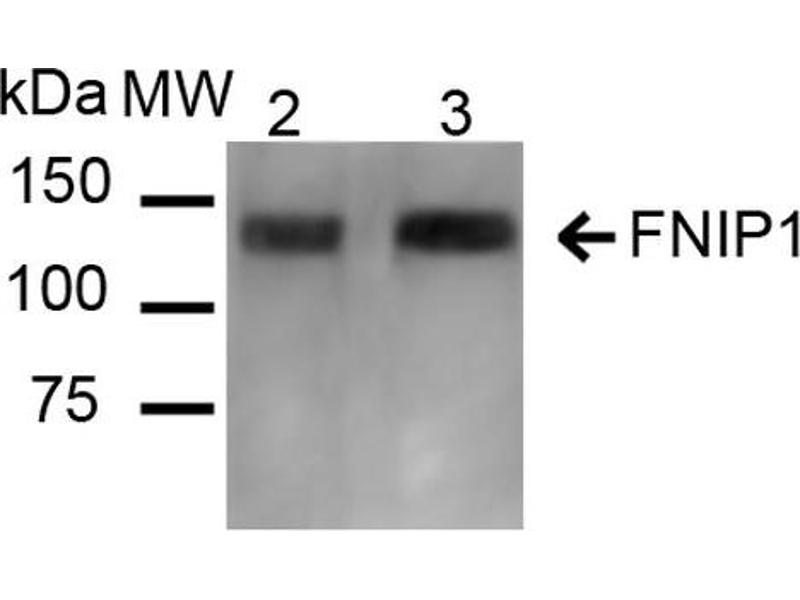 A 1:1000 dilution of ABIN5066851 was sufficient for detection of FNIP1 in 15 μg of mouse kidney cell lysates by ECL immunoblot analysis using goat anti-rabbit IgG:HRP as the secondary antibody.