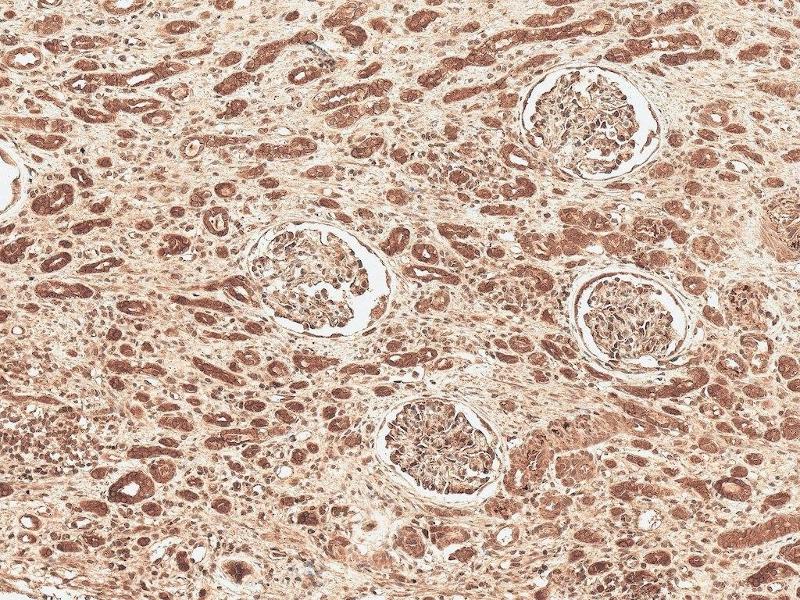 - Strong expression is found in the heart, liver placenta, muscle, nasal mucosa, salivary gland and uvula and moderate expression in kidney and lung. Higher levels detected in clear cell renal cell carcinoma (RCC) and chromophobe RCC than in normal kidney tissue.,Detects ~130 kDa.