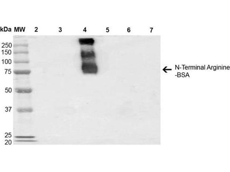 A 1:1000 dilution of ABIN5066978 was sufficient for detection of N-terminal Arginylation in 0.5 ug of N-terminal Arginine peptide conjugated to BSA by ECL immunoblot analysis using goat anti-mouse IgG:HRP as the secondary antibody.