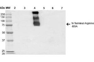 A 1:1000 dilution of ABIN5066980 was sufficient for detection of N-terminal Arginylation in 0.5 ug of N-terminal Arginine peptide conjugated to BSA by ECL immunoblot analysis using goat anti-mouse IgG:HRP as the secondary antibody.