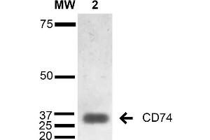 A 1:1000 dilution of ABIN5067048 was sufficient for detection of CD74 in 15 μg of B-Cell Lymphoma cell line Raji by ECL immunoblot analysis using Goat Anti-Mouse IgG:HRP as the secondary Antibody.