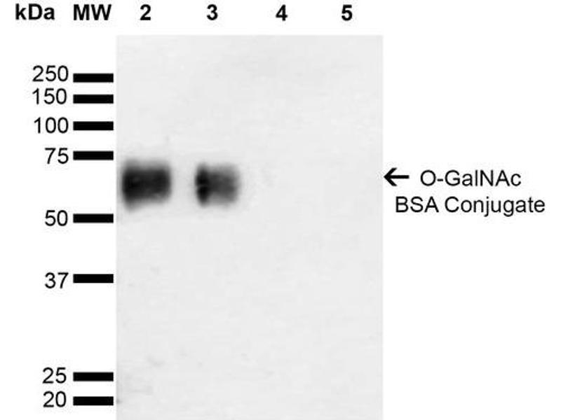 A 1:1000 dilution of ABIN5067155 was sufficient for detection of O-GlcNAc in 2 μg of O-GlcNAc conjugated to BSA by ECL immunoblot analysis using Goat Anti-Mouse IgG:HRP as the secondary Antibody.