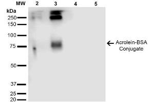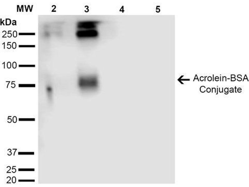 A 1:1000 dilution of ABIN5067173 was sufficient for detection of Acrolein in 2 μg of Acrolein conjugated to BSA by ECL immunoblot analysis using Goat Anti-Mouse IgG:HRP as the secondary Antibody.