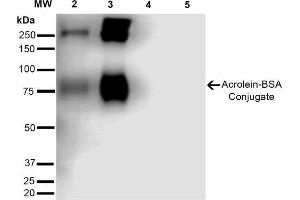 A 1:1000 dilution of ABIN5067194 was sufficient for detection of Acrolein in 2 μg of Acrolein conjugated to BSA by ECL immunoblot analysis using Goat Anti-Mouse IgG:HRP as the secondary Antibody.