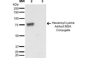 A 1:1000 dilution of ABIN5067247 was sufficient for detection of Hexanoyl Lysine adduct in 0.5 μg of Hexanoyl Lysine conjugated to BSA by ECL immunoblot analysis using Goat Anti-Mouse IgG:HRP as the secondary Antibody.