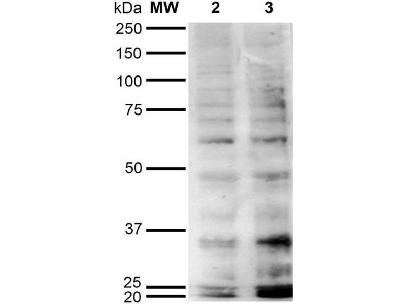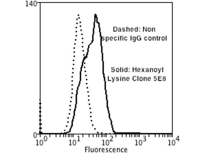A 1:1000 dilution of ABIN5067257 was sufficient for detection of Hexanoyl Lysine adduct in 0.5 μg of Hexanoyl Lysine conjugated to BSA by ECL immunoblot analysis using Goat Anti-Mouse IgG:HRP as the secondary Antibody.