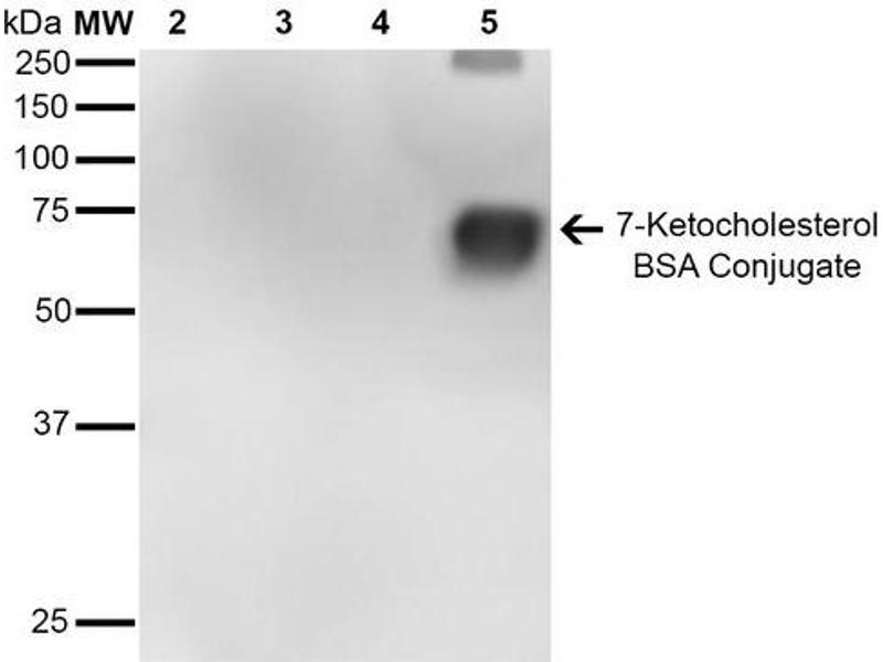A 1:1000 dilution of ABIN5067320 was sufficient for detection of 7-Ketocholesterol in 2 μg of 7-ketocholesterol conjugated to BSA by ECL immunoblot analysis using Goat Anti-Mouse IgG:HRP as the secondary Antibody.