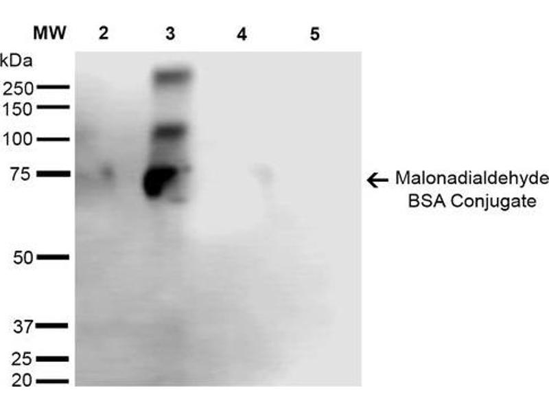 A 1:1000 dilution of ABIN5067344 was sufficient for detection of Malondialdehyde in 2 μg of Malondialdehyde conjugated to BSA by ECL immunoblot analysis using Goat Anti-Mouse IgG:HRP as the secondary Antibody.