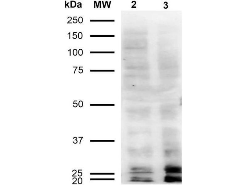 A 1:1000 dilution of ABIN5067374 was sufficient for detection of Malondialdehyde in 2 μg of Malondialdehyde conjugated to BSA by ECL immunoblot analysis using Goat Anti-Mouse IgG:HRP as the secondary Antibody.