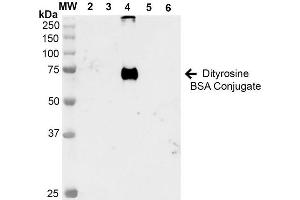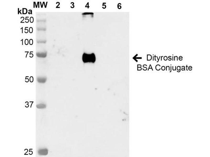 - Specific for dityrosine modified proteins. Does not cross-react with 3,5-dibromotyrosine or bromotyrosine modified proteins.