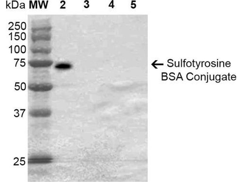 A 1:1000 dilution of ABIN5067489 was sufficient for detection of Sulfotyrosine in 0.5 μg of Sulfotyrosine conjugated to BSA by ECL immunoblot analysis using Goat Anti-Mouse IgG:HRP as the secondary Antibody.