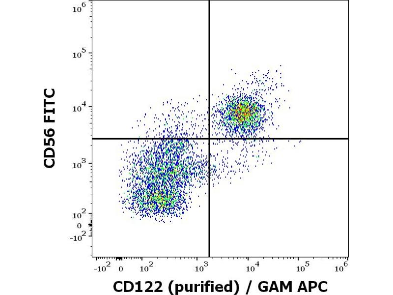 The mouse monoclonal antibody TU27 recognizes an extracellular epitope of CD122 (IL-2R beta), a 70-75 kDa type I transmembrane glycoprotein constitutively expressed by NK cells and a T cell subset, and upregulated upon activation.