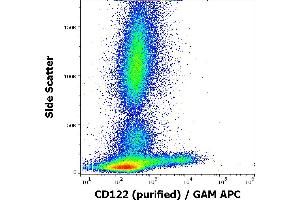 Interleukin 2 receptor subunit beta,CD122 (IL-2/IL-15R beta) constitutes together with CD132 (common gamma chain) and with CD25 (IL-2/IL15R alpha) the intermediate (CD122+CD132) and the high affinity (CD122+CD132+CD25) IL-2 and IL-15 receptor complex. CD122 is expressed on NK cells and lymphocytes, but at low level, unless the cell is activated. The cytoplasmic part of CD122 binds to Src-family and Jak-family kinases. The biological effect of CD122 ligation depends on whether IL-2 or IL-15 is bound to the receptor complex.,IL2RB, IL15RB, P70-75