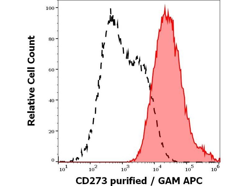 The mouse monoclonal antibody 24F.10C12 recognizes an extracellular epitope of CD273 / PD-L2 (also known as B7-DC), a 25 kDa type I transmembrane protein expressed by dendritic cells, activated monocytes and T cells, heart, first trimester placenta, lung and liver, as well as in Hodgkin´s lymphoma cells and primary mediastinal B cell lymphoma (PMBL).