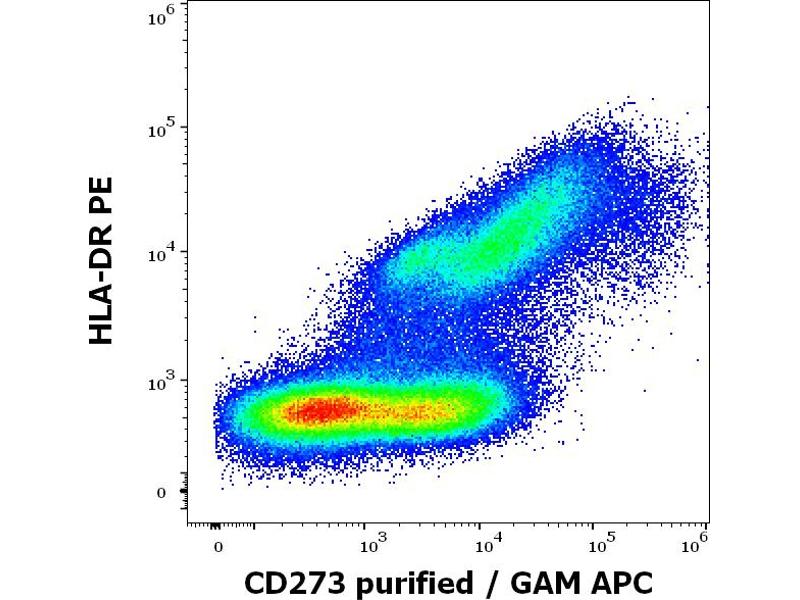 Programmed cell death 1 ligand 2,CD273 / PD-L2 (programmed death ligand-1), also known as B7-DC, is a member of the B7 family of regulatory proteins. It costimulates the proliferation of T cells, and mediates IFN gamma production. Ligation of CD273 on dendritic cells enhances dendritic cell activation and T cell responses. When interacting with CD279, it can act as a coinhibitor of the T cell function. CD273 expression is a useful marker to distinguish primary mediastinal B cell lymphoma from other diffuse large B cell lymphomas.,PDCD1LG2, B7DC, Btdc, PDL2, PDCD1L2, bA574F11.2, Butyrophilin, B7-DC,