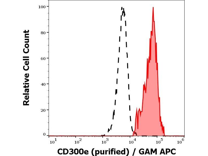 The mouse monoclonal antibody UP-H2 recognizes an extracellular epitope on CD300e / IREM-2, a 32 kDa glycoprotein expressed by mature monocytes and peripheral blood myeloid dendritic cells.
