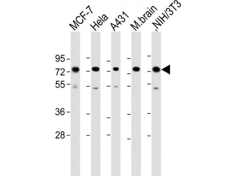 This MTA1 antibody is generated from rabbits immunized with a KLH conjugated synthetic peptide between 659-687 amino acids from the C-terminal region of human MTA1.