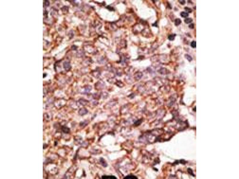 This SIGLEC6 antibody is generated from rabbits immunized with a KLH conjugated synthetic peptide between 381-412 amino acids from the C-terminal region of human SIGLEC6.