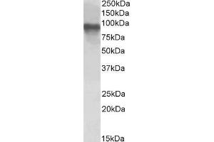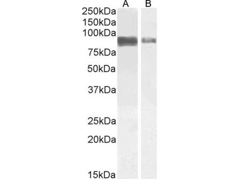 Western Blot: Approx 90 kDa observed in lysates of cell line Jurkat and in preliminary testing of NIH3T3, and approx 85 kDa in Rat Brain lysates and lysates of cell line A431 (calculated MW of 73.2 kDa according to Human, NP_083157.1) and Rat NP_001029067
