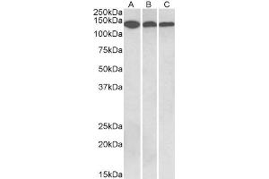 Western Blot: Approx 140 kDa band observed in Human, Mouse, Rat and Pig Brain lysates (calculated MW of 113 kDa according to NP_001834.2). The observed molecular weight corresponds to the glycosylated form. Recommended concentration: 0.3-1 μg/mL. Primary in