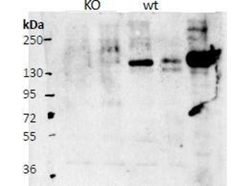 Western Blot: Approx 150 kDa band observed in Mouse Brain lysates and not in the same lysates from the KO mice (calculated MW of 113 kDa according to NP_001103219.1). Recommended concentration: 0.5-1.5 μg/mL.