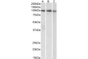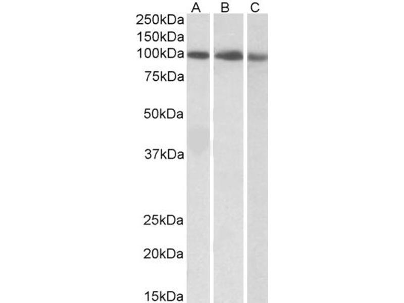 Western Blot: Approx 100 kDa band observed in lysates of cell line NIH3T3 and in Mouse Lymph node lysates and approx. 90-100 kDa in lysates of cell line K562 (calculated MW of 90.6 kDa according to Human NP_003143.2 and 90.8 kDa according to Mouse NP_0013496