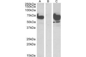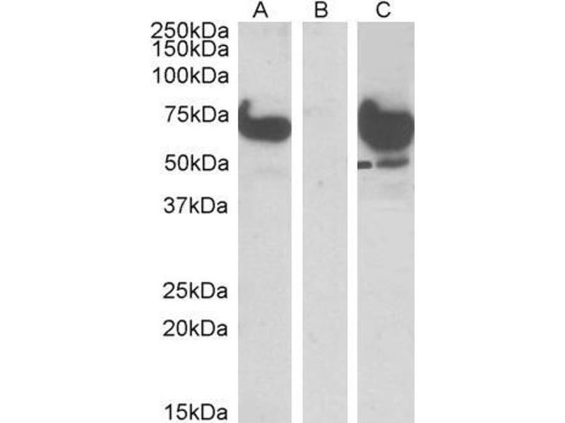 Western Blot: In transfected HEK293 transiently expressing full-length Human EPM2AIP1 (myc and DYKDDDDK tagged), a band of approx. 75 kDa was observed. No bands were observed in mock-transfected HEK293 and the same band was observed using anti- DYKDDDDK t