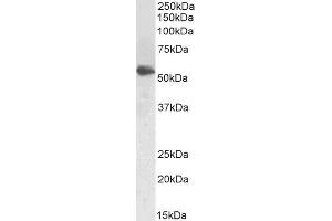 Western Blot: Approx 55 kDa band observed in Human Testis lysates (calculated MW of 49.6 kDa according to NP_000220.1). This molecular weight is routinely observed by other sources. Recommended concentration: 0.3-1 μg/mL. Primary incubation 1 hour at room t